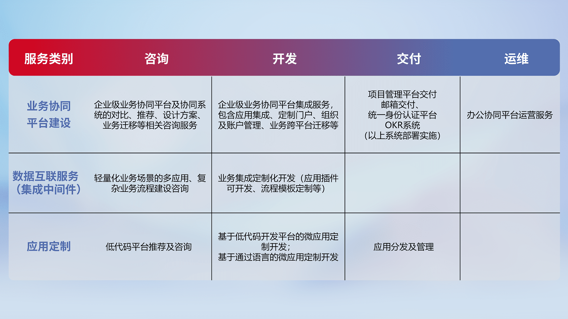 针对钉钉、、、、企微、、、IDaas等平台级产品提供产品的规划、、、方案、、交付、、、定制化开发等服务,,,实现如统一协同办公、、智能客户服务、、混合会议管理、、、智能数据查询、、、、等业务场景,,,实现数字化转型。。。。