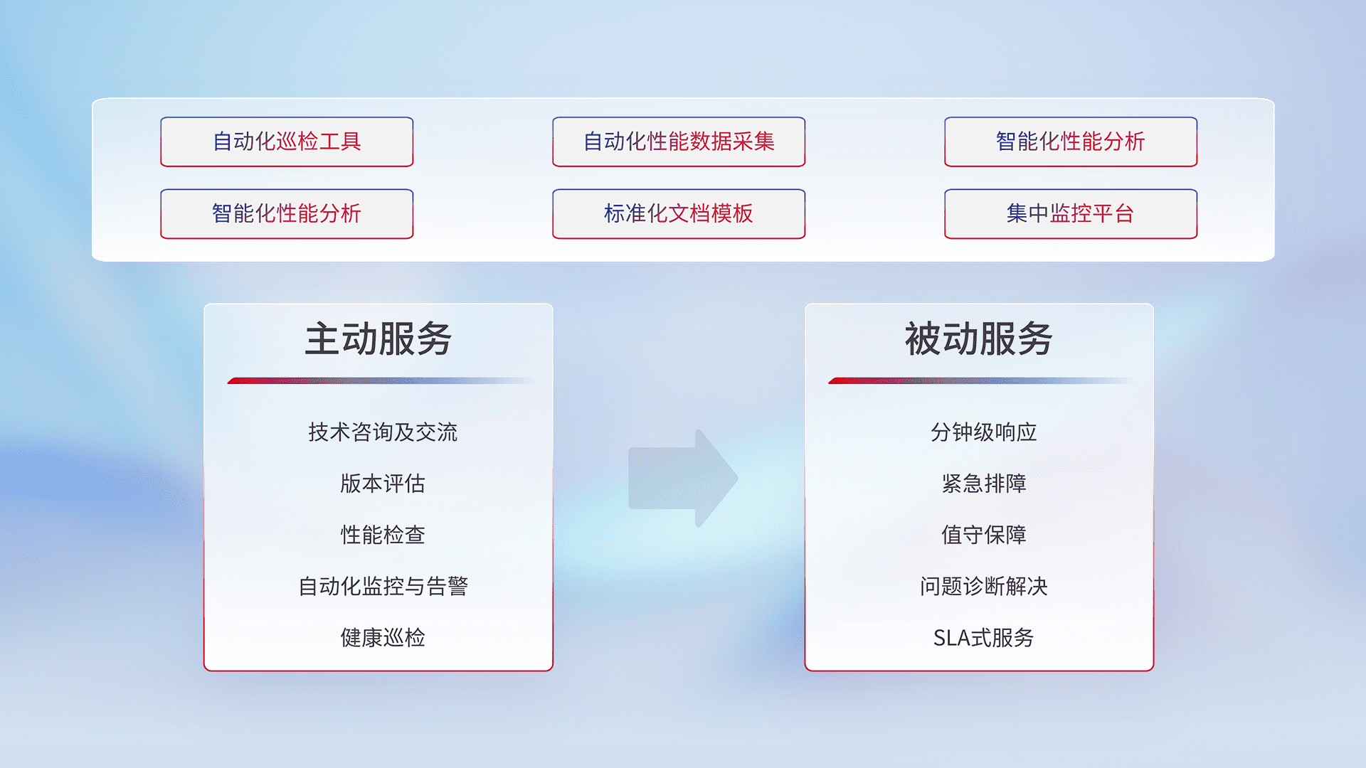 智能化工具和标准化文档,,保障服务质量,,,提供主动服务(包含技术咨询、、版本评估、、、、性能检查、、、自动化监控与告警、、健康巡检)和被动服务包含(分钟级响应、、、紧急排障、、值守保障、、问题诊断解决、、、SLA服务)。。。。